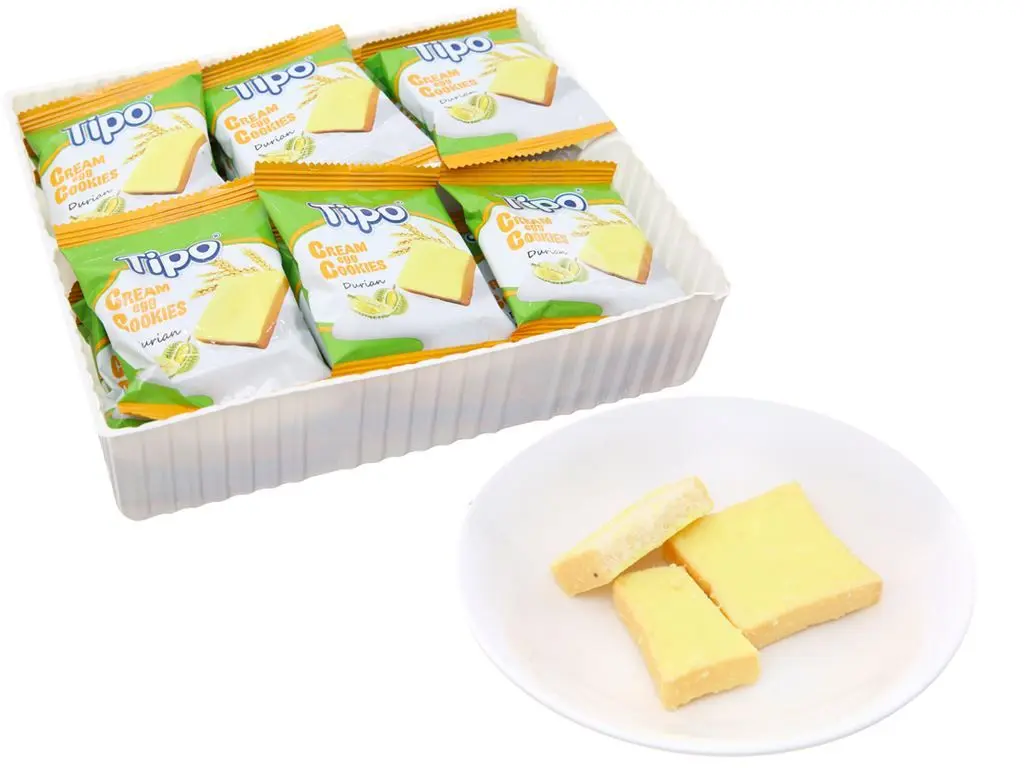 ベトナムで人気のTIPO COOKIESのドリアン味。新鮮な卵を使って焼き上げたサクサクとした食感のクッキーの上にドリアンクリームペーストがオン。アジアンテイスト抜群のドリアンクッキーはくせになるうまさです。。個包装で食べやすさ抜群!