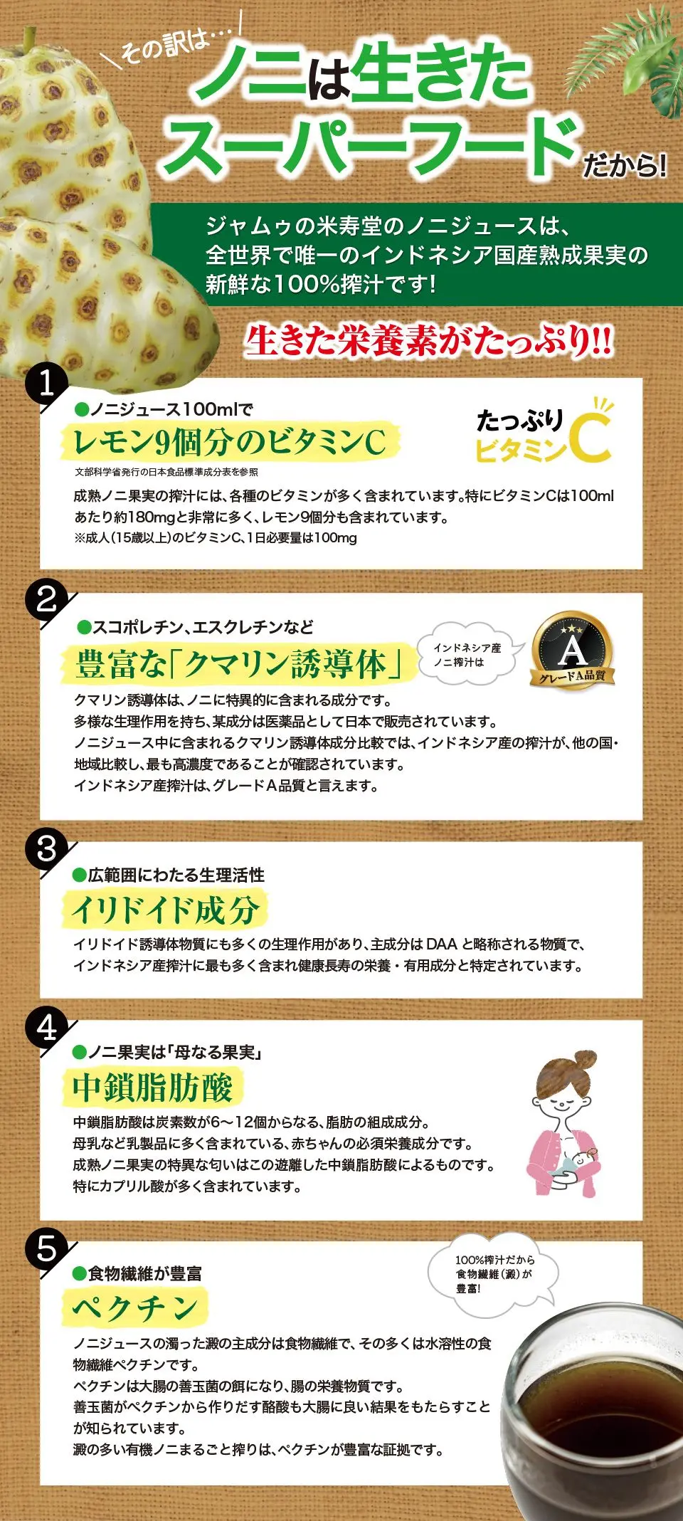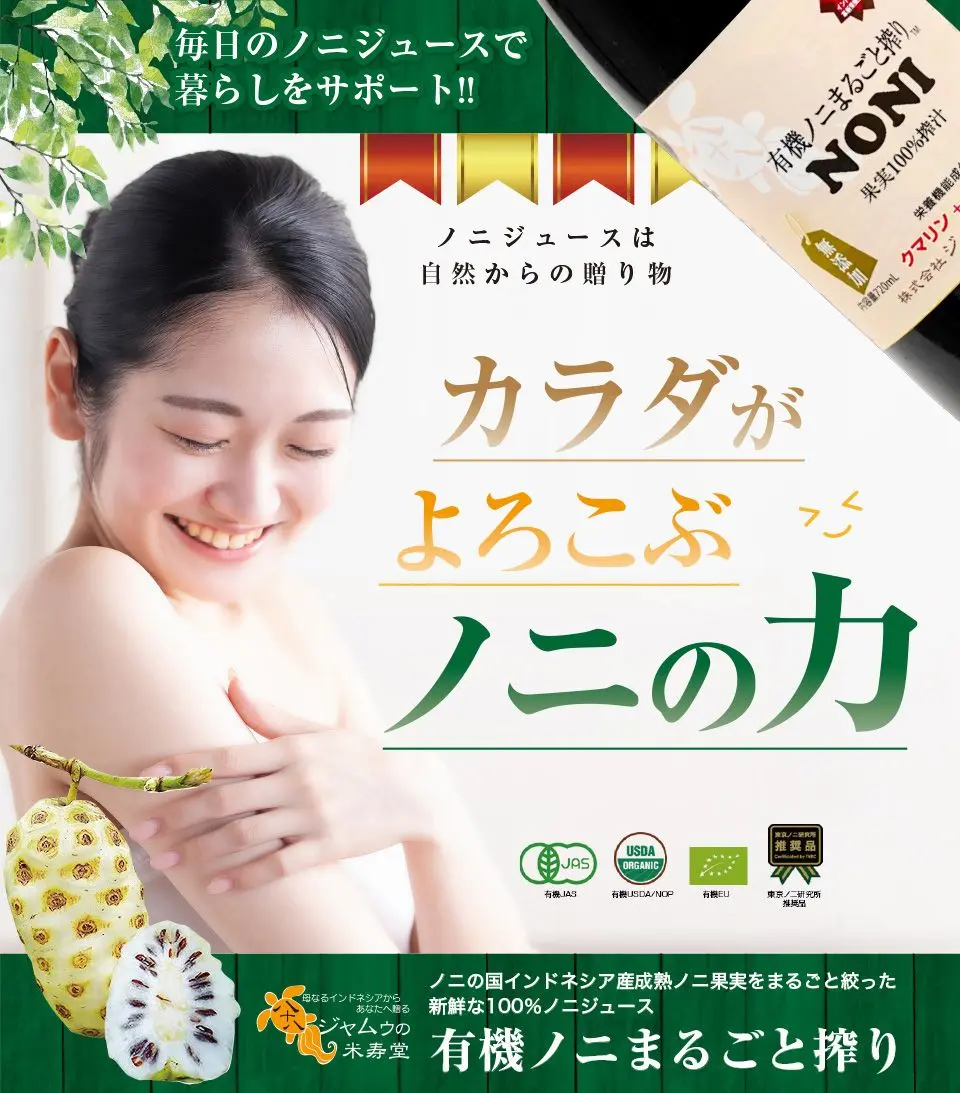 熱帯薬用果実ノニの原産国インドネシア国産の無添加・新鮮果実ジュースの「有機ノニまるごと搾り」は世界唯一の搾汁。